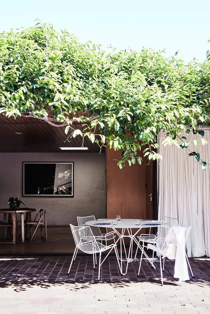 “This house is the perfect entertainer, it’s another reason we were drawn to it,” Lill tells. The outdoor dining area features a white table from Spence & Lyda and vintage chairs. There’s also a tennis court and plenty of shade for hosting barbecues.