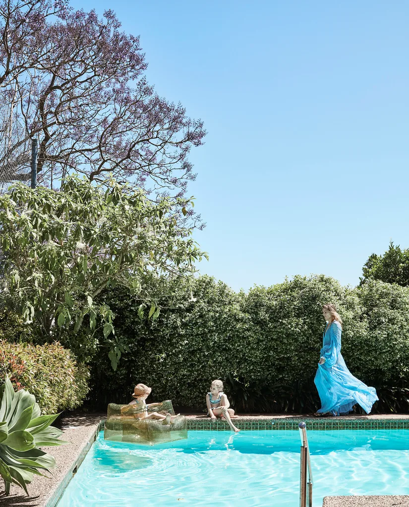 While homeowner Lill entertains guests poolside, her daughters prefer to play in the solar-heated pool.
