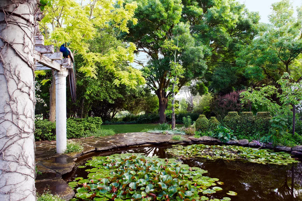 Al-Ru Farm’s resident peacock surveys the lily pond from atop the ‘Acropolis’. The acid yellow leaves of Robina pseudo acacia ‘Frisia’ and purple smoke bush (Cotinus coggygria) contrast with the surrounding greenery.