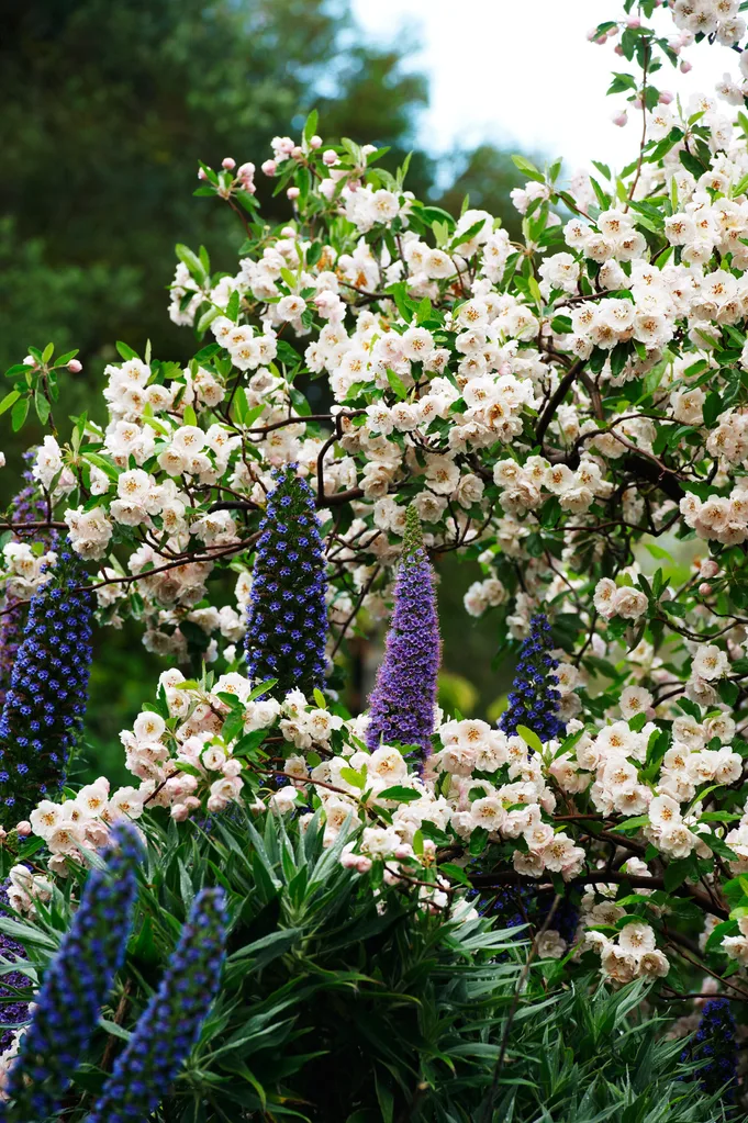 The wedding garden is planted out with massed roses, including ‘Lamarque’, ‘Climbing Iceberg’ and cherokee roses (Rosa laevigata), entwined in walls of black-painted lattice. It looks amazing. “Yes, it looks wonderful but don’t do it!” says Ruth. “Pruning those roses is a nightmare – the lattice has to be completely taken off the fence and laid on the ground, then nailed up again after pruning. And as the roses get older they seem to get stronger, thornier and tougher to prune.” The white roses are complemented by the silvery foliage of an ornamental pear (Pyrus salicifolia) and honey bush (Melianthus major), and in the height of summer, blue-flowering agapanthus adds to the handsome display.