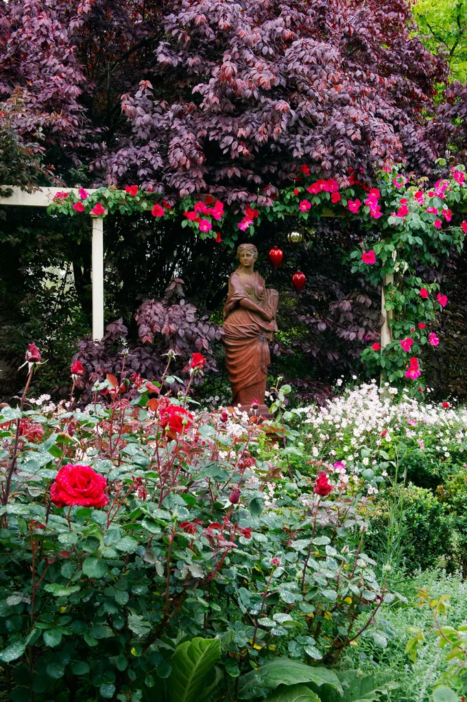 A garden statue is framed by ‘Nancy Hayward’ roses.