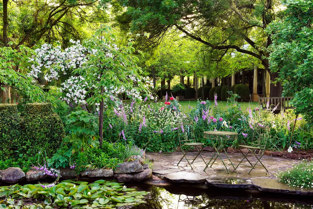 The tranquil spot by the pond is surrounded by beds filled with foxgloves and poppies. Waterlilies and white-blossomed crabapple add to the display.