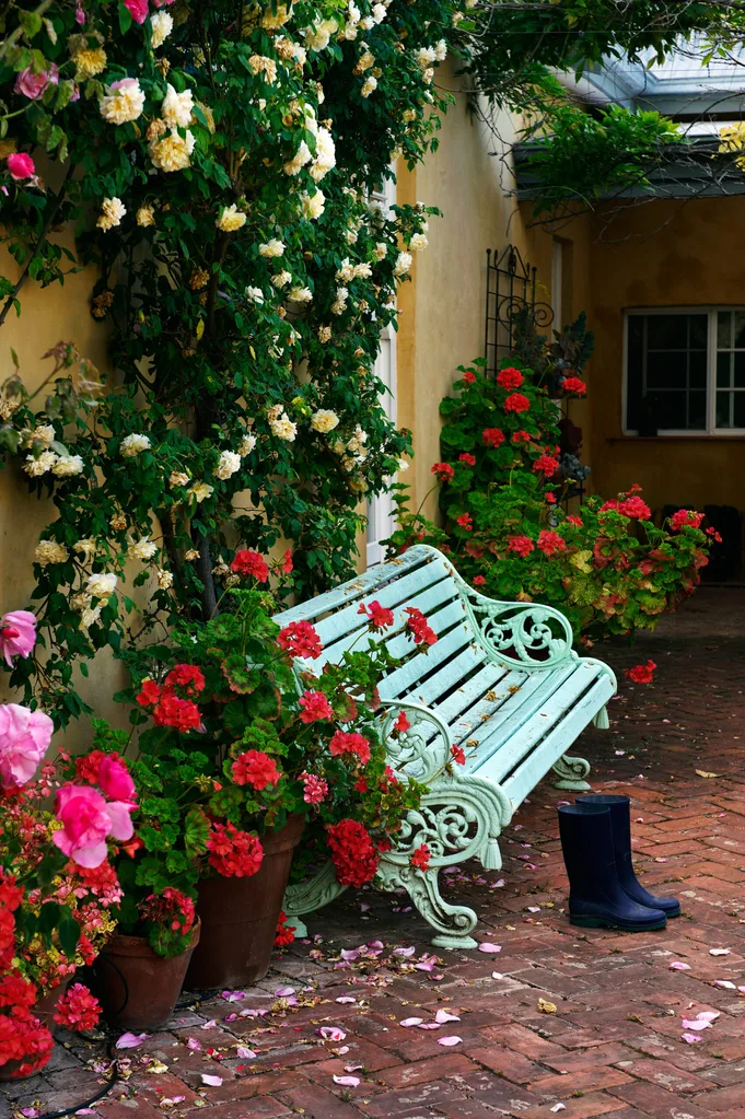 Scarlet pelargoniums in pots surround a pretty bench, the perfect spot to pause and smell the ‘Desprez à Fleurs Jaune’ roses.