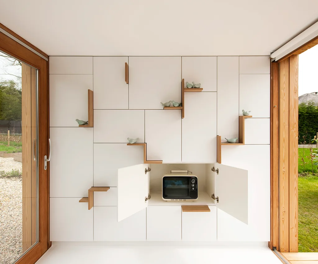 Behind the different-sized doors are a fold-down desk, a television and storage for garden chairs and work files and folders. There’s even a designated space for an electric heater.