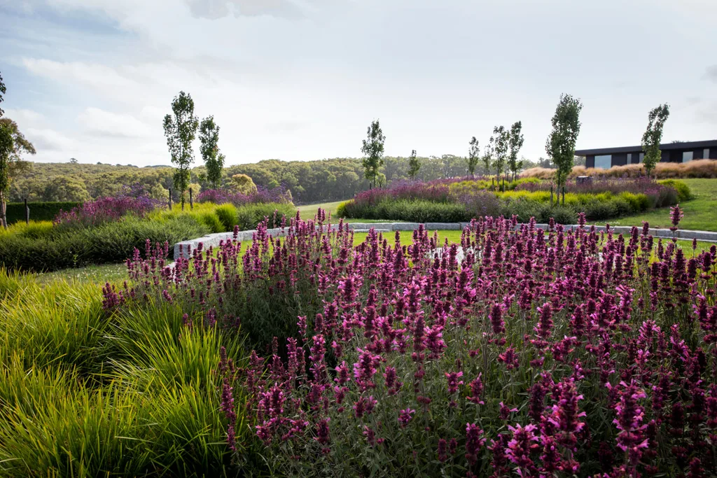 While the owner gave Paul the freedom to explore softer planting styles and play with colour, he was steadfast about keeping maintenance to a minimum. Paul points out that although there’s lots of mowing involved, the area receives summer rain and those lawns remain lush with little watering. Many of the plants have low water requirements, too. “The herbaceous perennials and olive trees love dry conditions,” he says. When it comes to those borders planted with noble Panicum virgatum and Lomandra ‘Lime Tuff’ grasses, it’s not the upkeep that takes the most time. “This project involved experimenting with plant combinations and figuring out what goes well together,” Paul says. “There are myriad ornamental grasses to choose from, but getting them to flower at the right time and reach the right height was the challenge.”