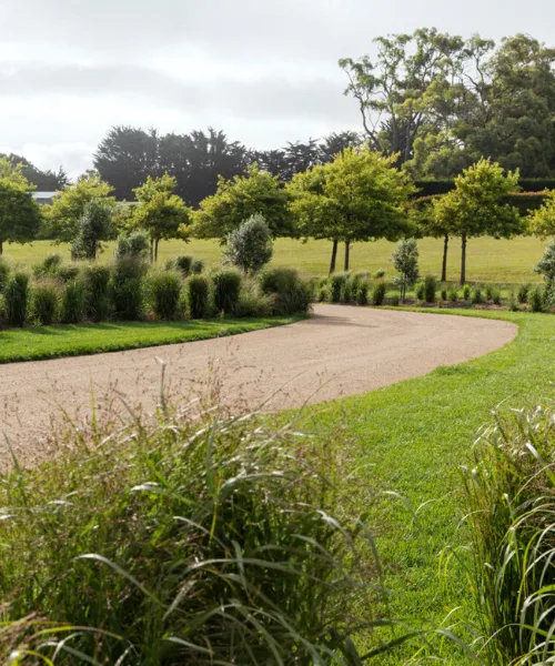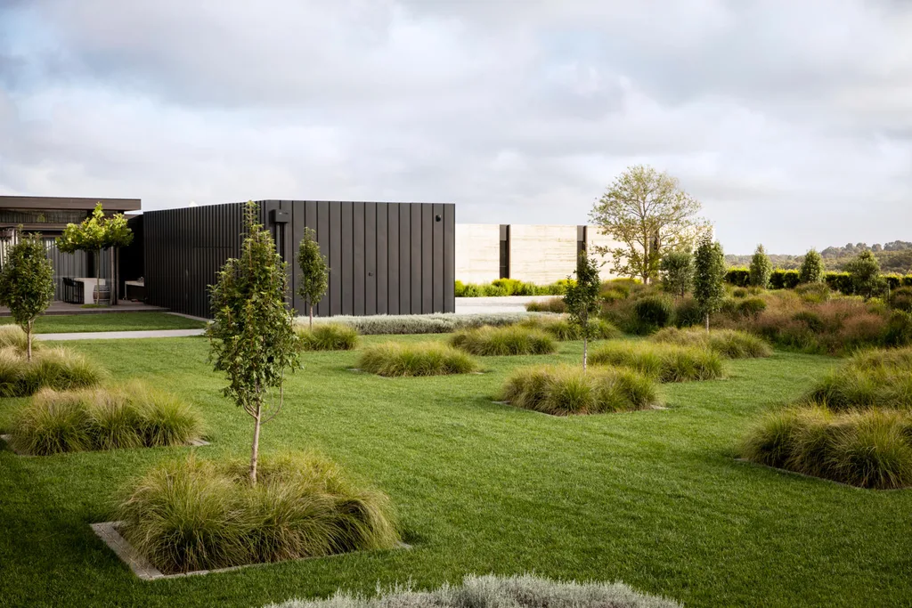 The project was ripe with potential from the get-go. “I was approached about three years ago by an old client of mine,” Paul says. “He’d decided to build a holiday house on his property, a working avocado farm, and he called me when the house was almost finished.” The first time Paul saw the property, a vast stretch of land exposed to coastal winds, he recalls travelling down an established driveway chaperoned by rows of pin oaks. The juxtaposition between the frothy canopies of those existing trees and the contemporary facade of the house informed the design, as did the owner’s brief. “He showed me lovely images of European gardens with lawns, structured grids of trees and large herbaceous borders,” Paul says. “He wanted something contemporary, to go with the house. And not too much maintenance.”
