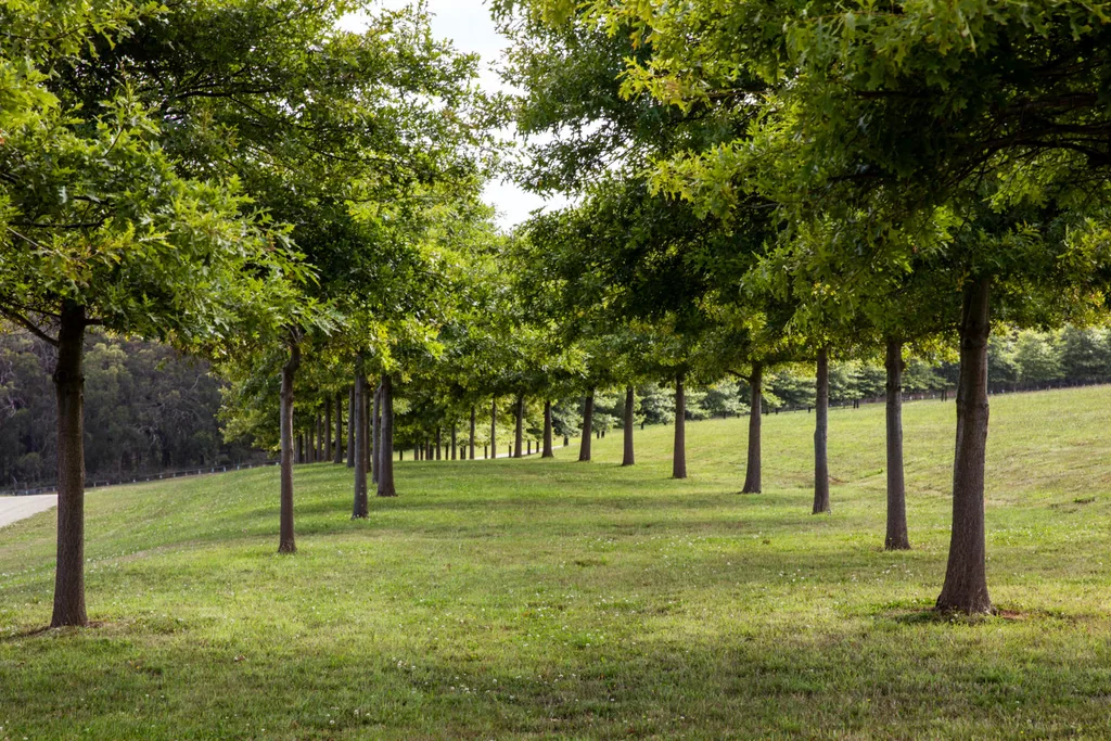These pin oaks had already been planted along the driveway before Paul took on the two-year project. Ryegrass turf travels as far as the eye can see.