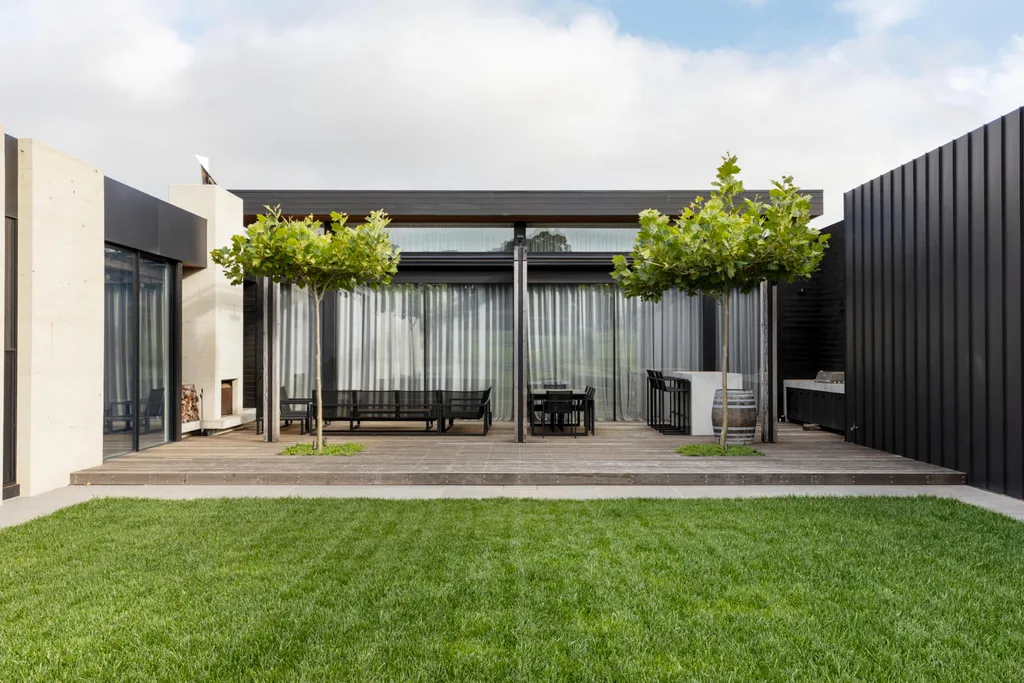 Two statuesque London plane trees (Platanus × acerifolia) stand proud within the outdoor dining area’s timber deck. The manicured lawn completes the beautifully composed scene.