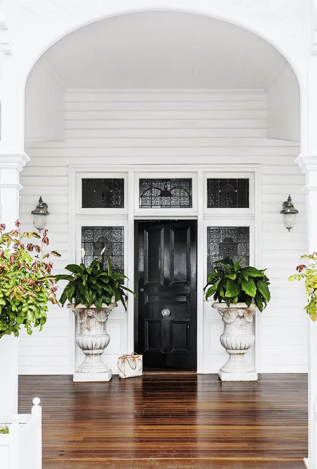 A stunning front door painted Dulux Obsidian is framed by restored floor tiles and a spilling over of climbing greenery at this heritage home in Parsley Bay.