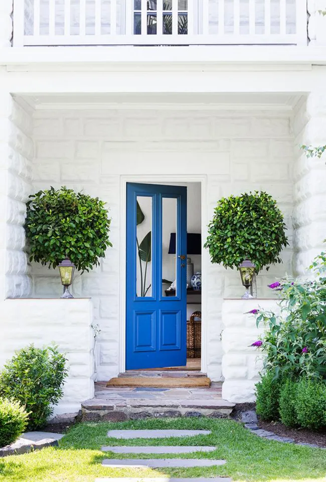 A blue statement door with glazed panels gives visitors a glimpse of this Hamptons style home’s breezy decor and stands out against the refreshing white exterior.