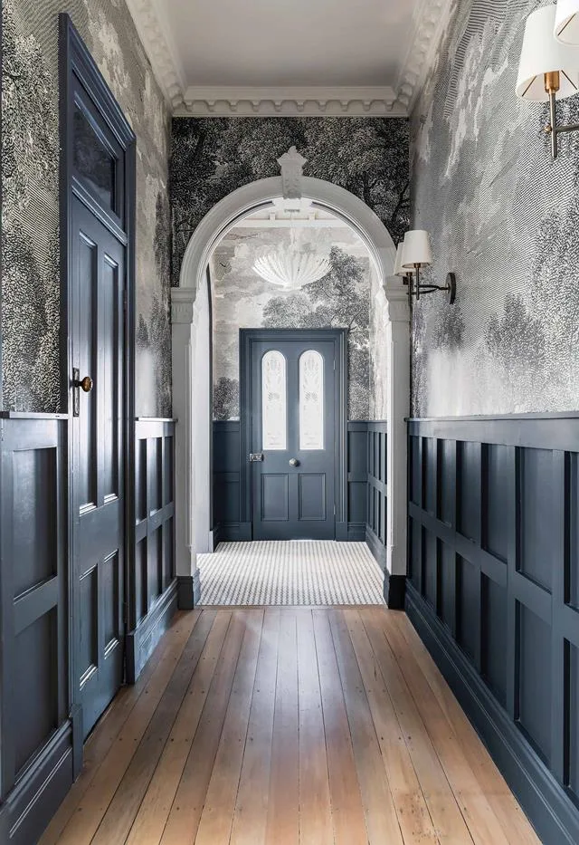 Mural-style Etched Arcadia wallpaper from Anthropologie in this charming Federation home has been used throughout the hallway to the entryway’s calming blue front door.