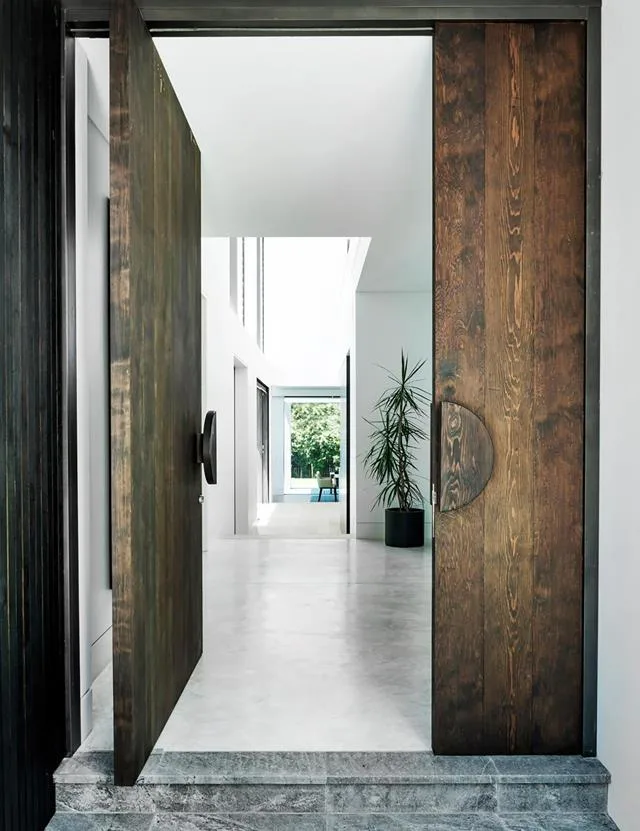 was replaced with a striking pair of timber ones, and framed in glass in order to flood the foyer with light.