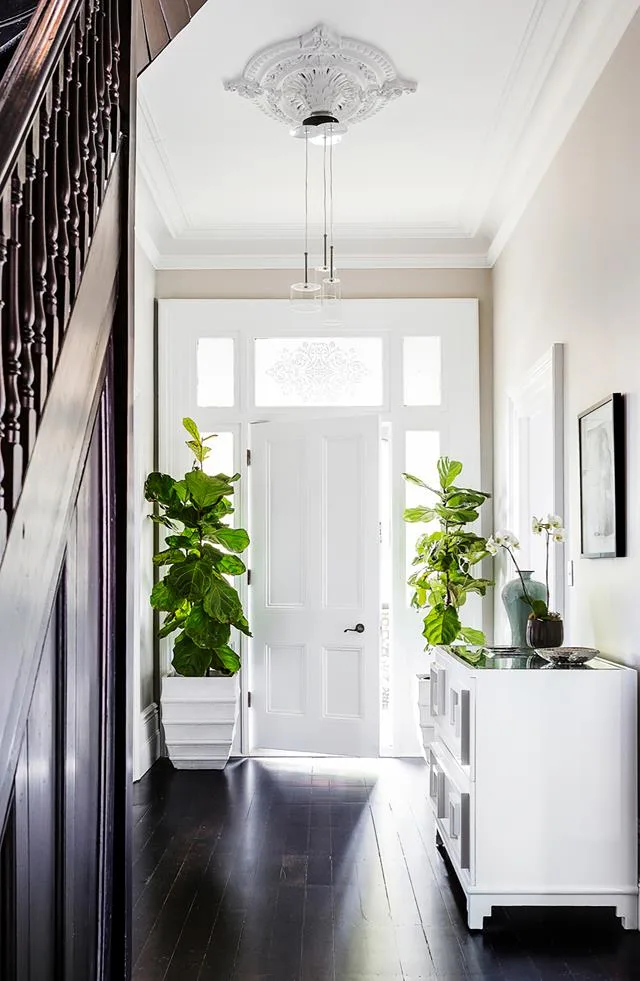 The devil is in the detail for interior designer Brendan Wong who finessed this 1890s home into a modern gem. Black Japan floors in the hallway lead to the white front door where the framing floods light into the entrway.
