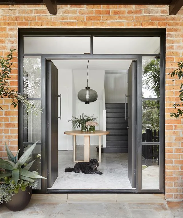 “I love the front door and the view through the hall to the back lawn,” says owner Polly of her modern yet timeless family home. “It reminds me of a Californian desert house.” The western red cedar pivot door has a 30cm black-stained timber-disc handle.