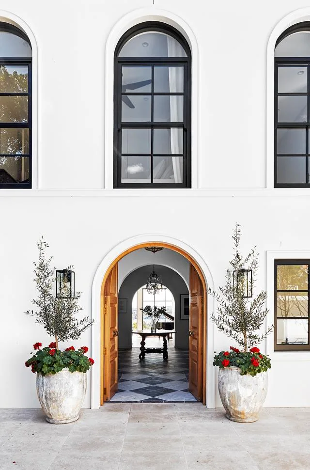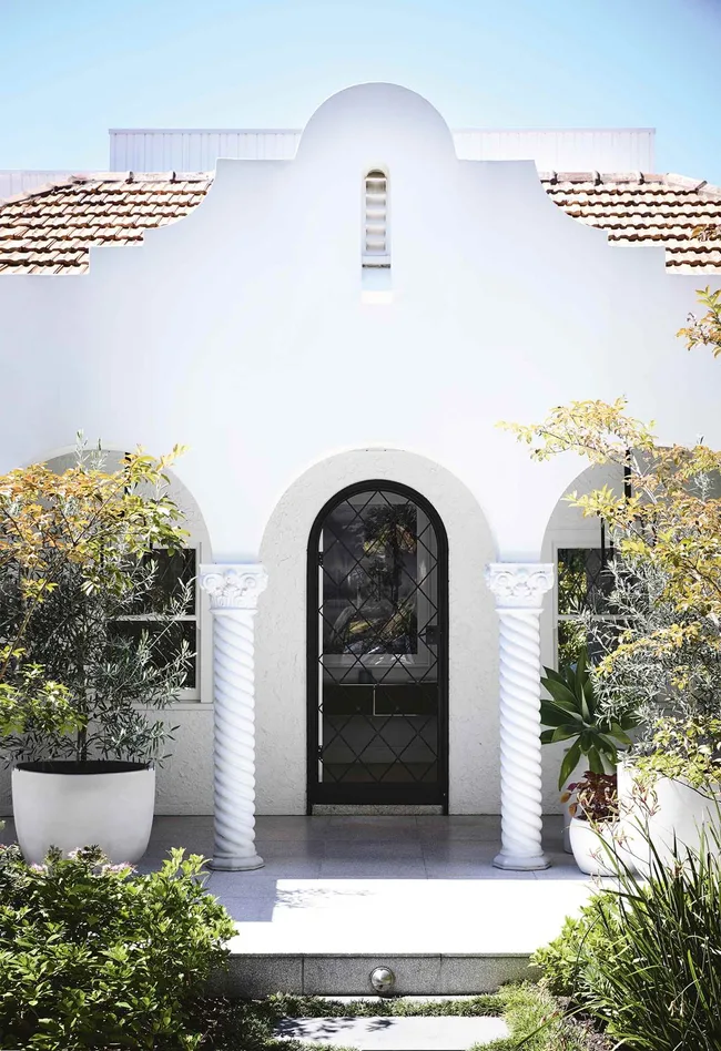 Homeowner Tam saw past the former salmon-pink exterior of this 1930s Spanish Mission-style house, which was transformed with paint in Dulux Lexicon Quarter. Matt black detailing as seen on the arched front door adds depth and interest.
