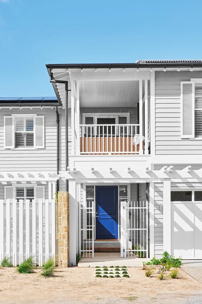 A bright blue front door introduces the Hamptons-meets-contemporary theme of this stunning new home in Barwon Heads on Victoria’s Bellarine Peninsula.