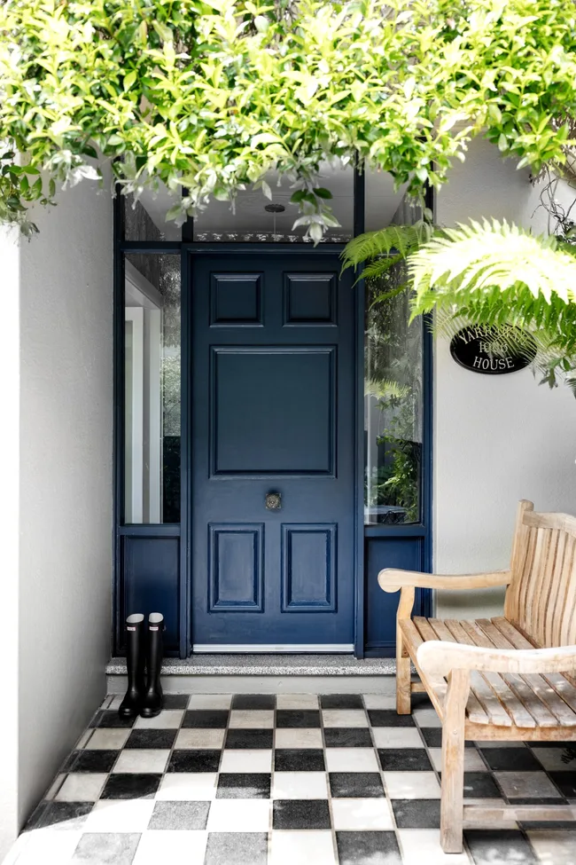 This grand entryway is befitting of the reimagined historic Sydney home it is attached to. Softness is brought to the check pattern tiles via a beautiful large bay tree.