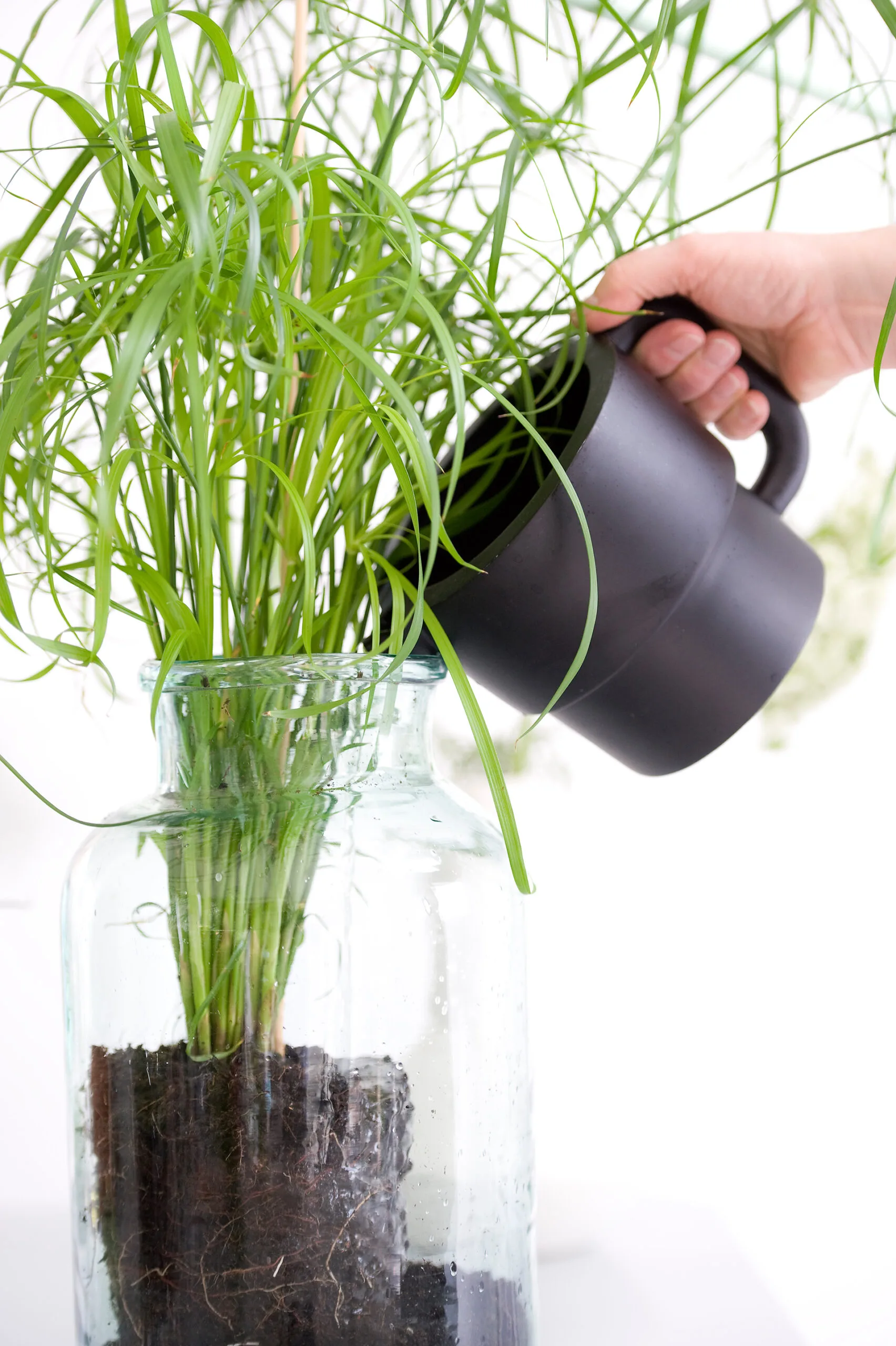 Grass-like plants, such as sedges and rushes, love moisture and don’t mind wet feet, so the water doesn’t have to drain away. Display them in glass vases for a light and airy feel.