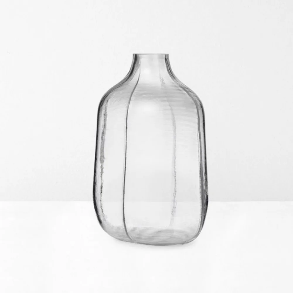 This organically shaped vase with elegantly fluted glass looks stunning on its own or in a group. It is also available in amber and blue hues for those looking to add a pop of colour to the home.