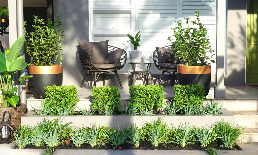 New furniture and more shrubs enhance the entrance and offer another spot to sit.