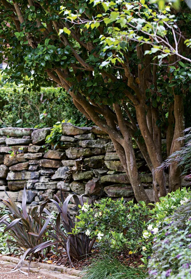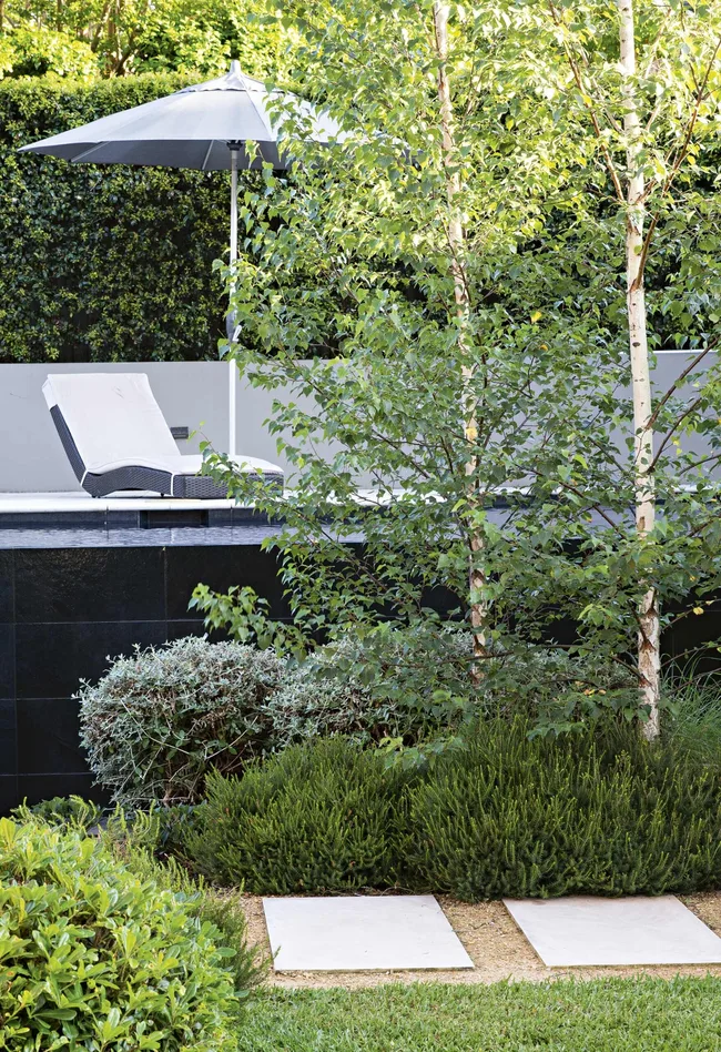 Stumpy caught up with the other trees recently, and Penelope says its colour has been the most magnificent yet. As the trees mature, they’ll add to the garden’s privacy. Lilly pilly (Syzygium paniculata) was used for the boundary hedge due to its even and fast coverage. In conjunction with the retaining wall, it forms an unobtrusive perimeter while further enhancing privacy.