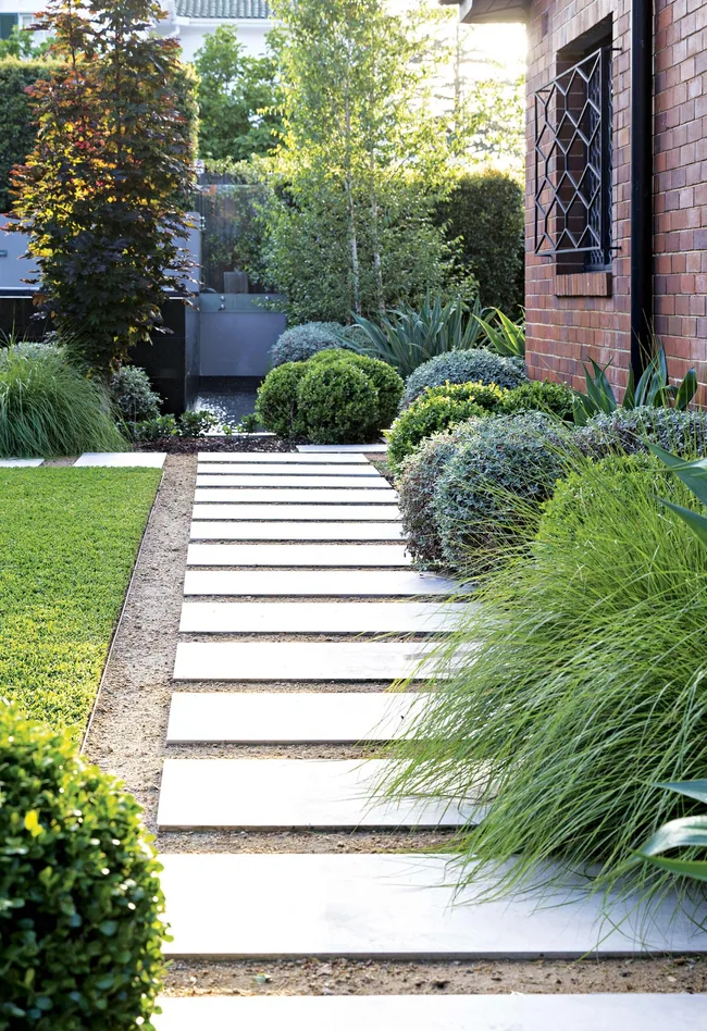 Plant colours out the back are primarily from foliage, with flowers making only a fleeting appearance. Understated silvers and greens of curry plant, Mexican lily and Pennisetum grass grace the garden’s borders. They work harmoniously alongside limestone steppers set in decomposed granite and silvered spotted-gum decking boards.