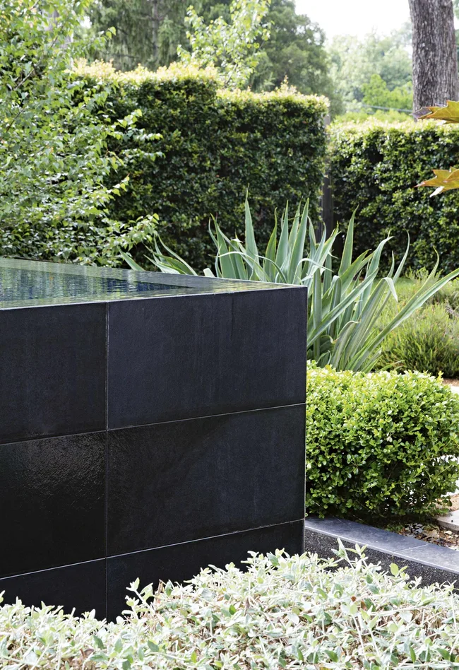 Large-format black tiles on the pool’s wet wall provide a link to the home’s charcoal accents. The elevated lounge platform enhances the spacious feel and provides a second entertaining area with a view across the lawn to the pavilion.