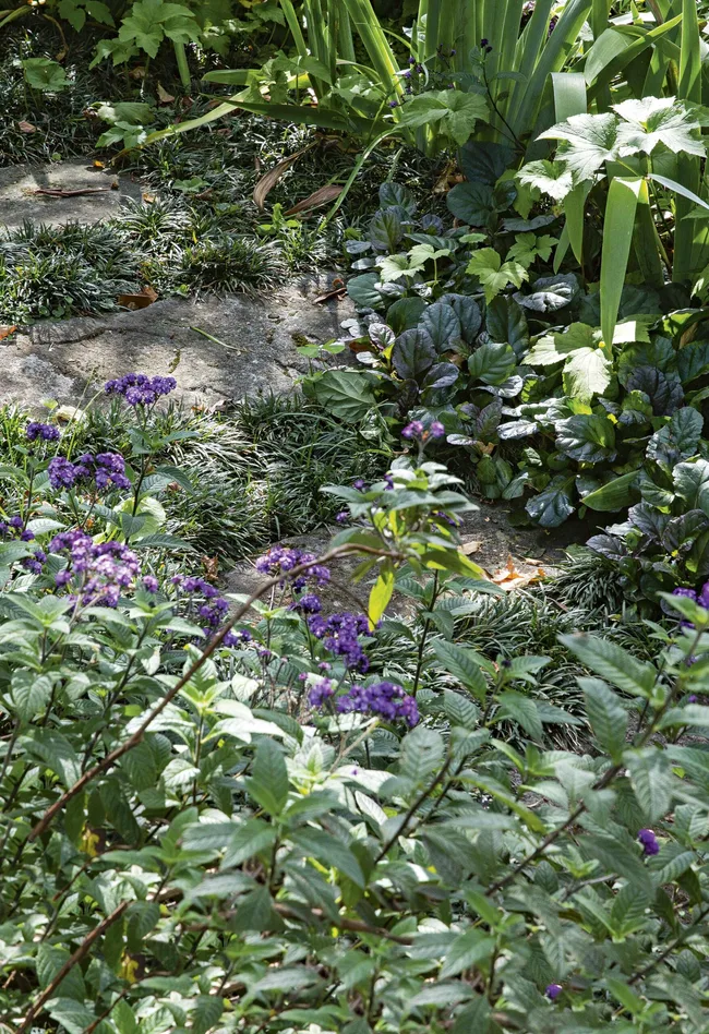 In the front garden, the design took a more traditional approach. The original gravel driveway and stone retaining wall were kept, while generous groves of birch trees are clustered on either end, framing the lawn and casting dappled sunlight across the space. Near the home’s entry, traditional plantings of hydrangea, ‘Iceberg’ rose and heliotrope were retained and reinforced.