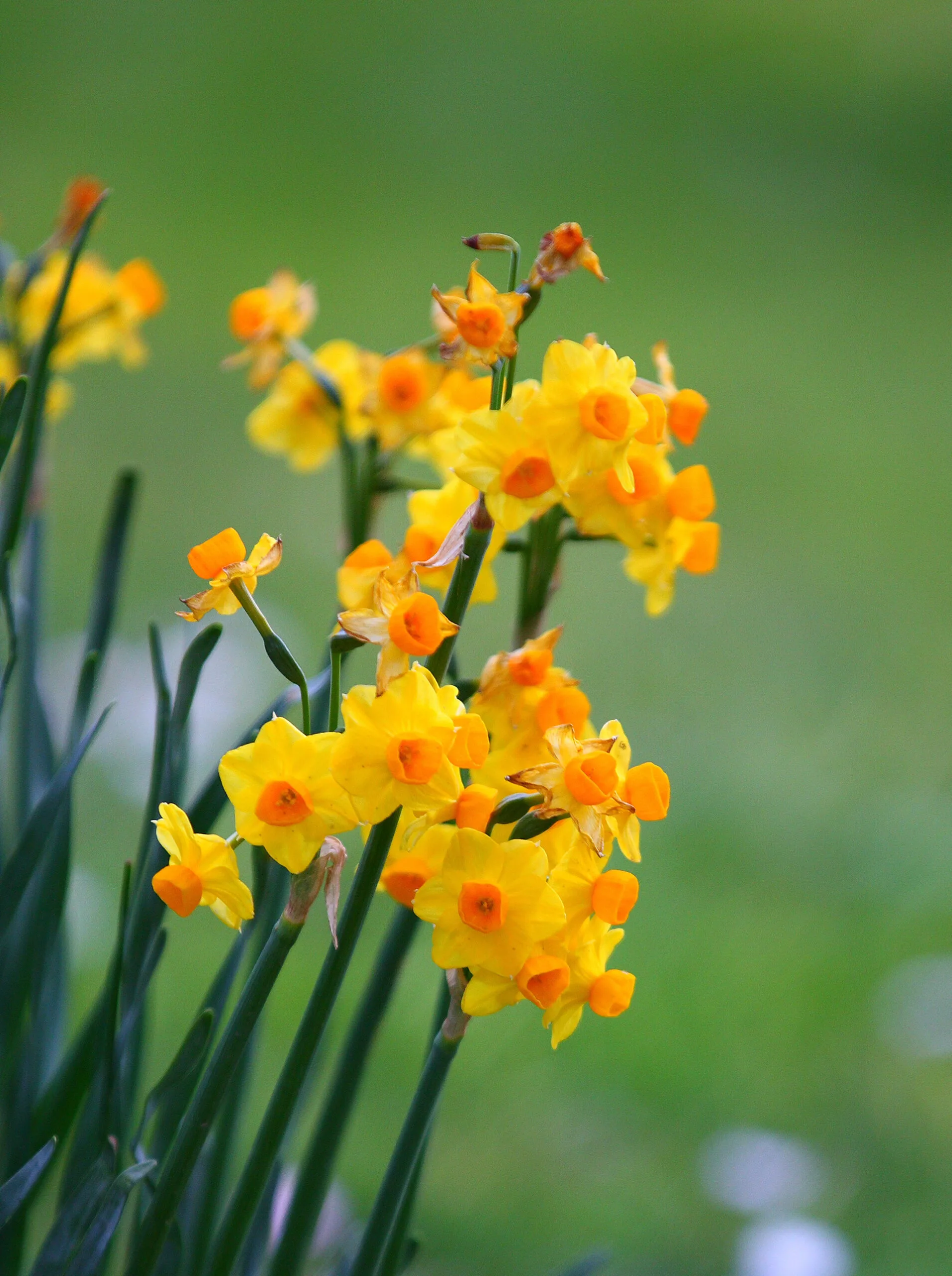 The flowers we call narcissus or jonquil have clusters of small flowers each with white petals and a small yellow or white cup or yellow petals and an orange cup. These come from the Mediterranean and are classified broadly as Narcissus tazetta. Jonquils have a very distinctive and overwhelming scent.