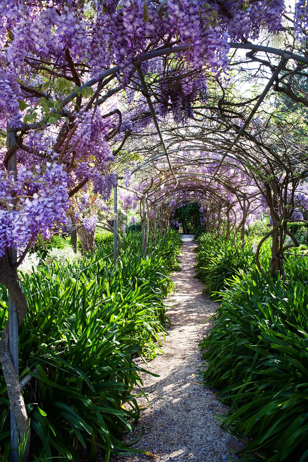 Wisteria offers fragrant blooms in spring and shade in summer, then loses its leaves to let in the winter sun. This walkway is covered in the perfumed tendrils of wisteria.