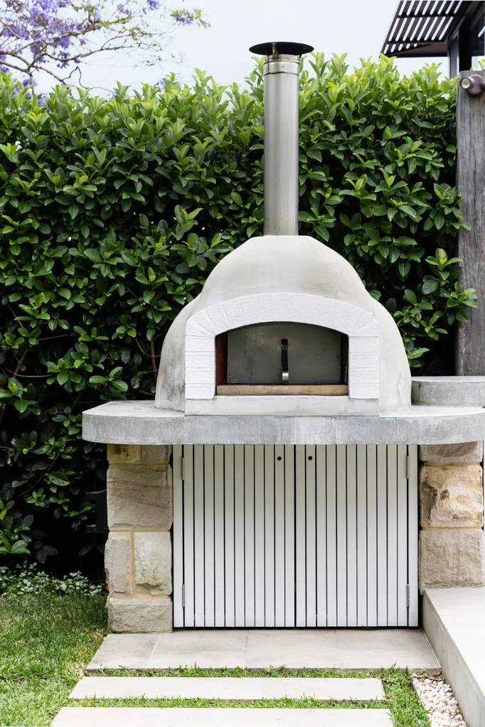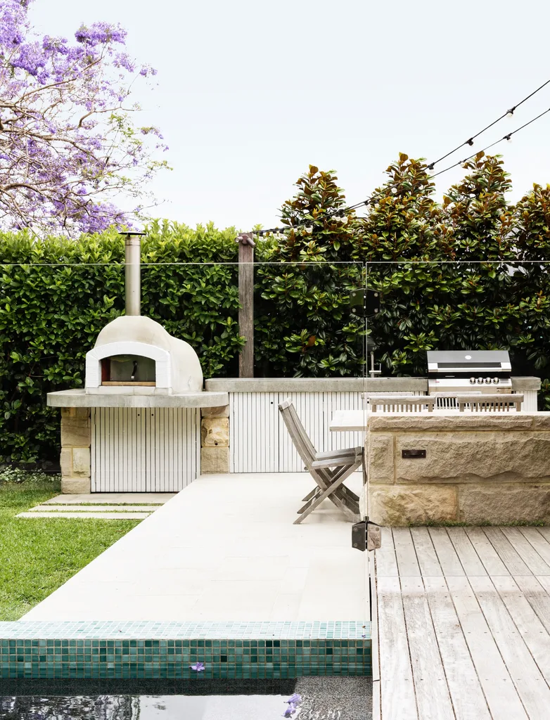 An equally striking outdoor kitchen sports all the bells and whistles, with a pizza oven – always a family favourite – as the centrepiece, a six-burner barbecue, fridge, sink and generous amounts of storage. Festoon lights strung between hardwood posts foster a party atmosphere after the sun goes down.