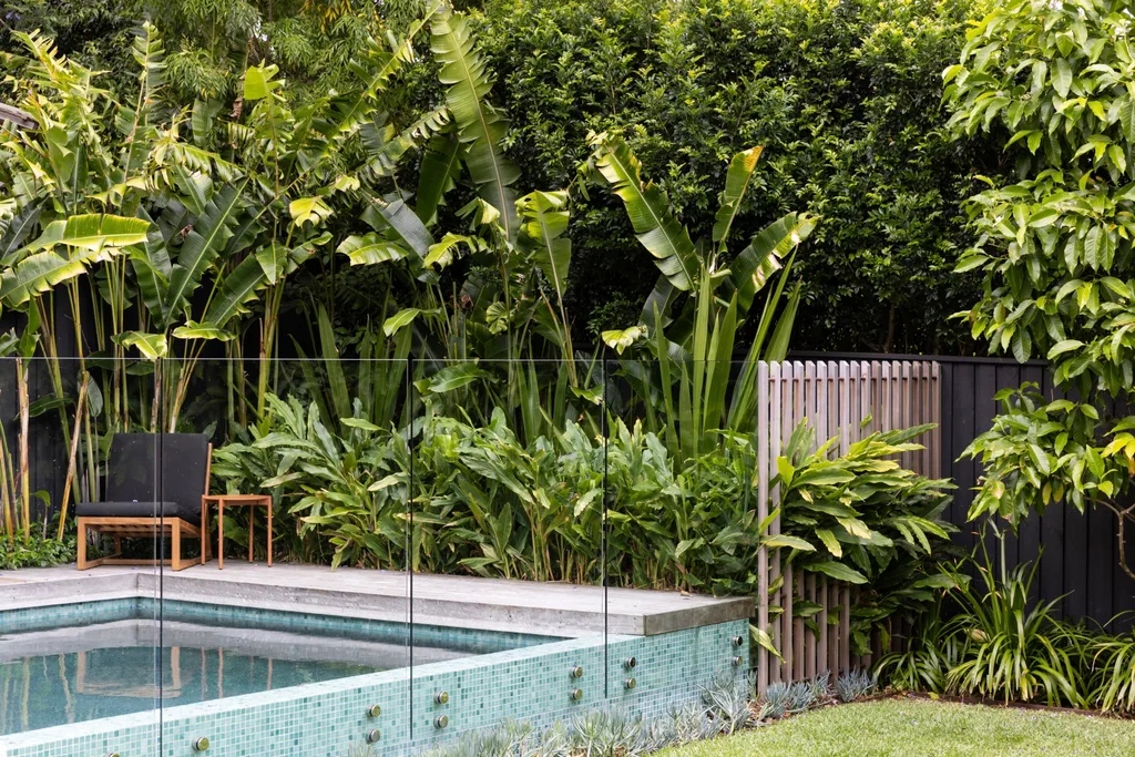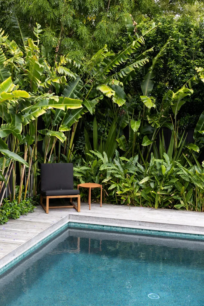With its generous foliage, the back garden has a wonderful sense of enclosure. Massed plantings of heliconia, dwarf cardamom and star jasmine bring lushness to the pool area.