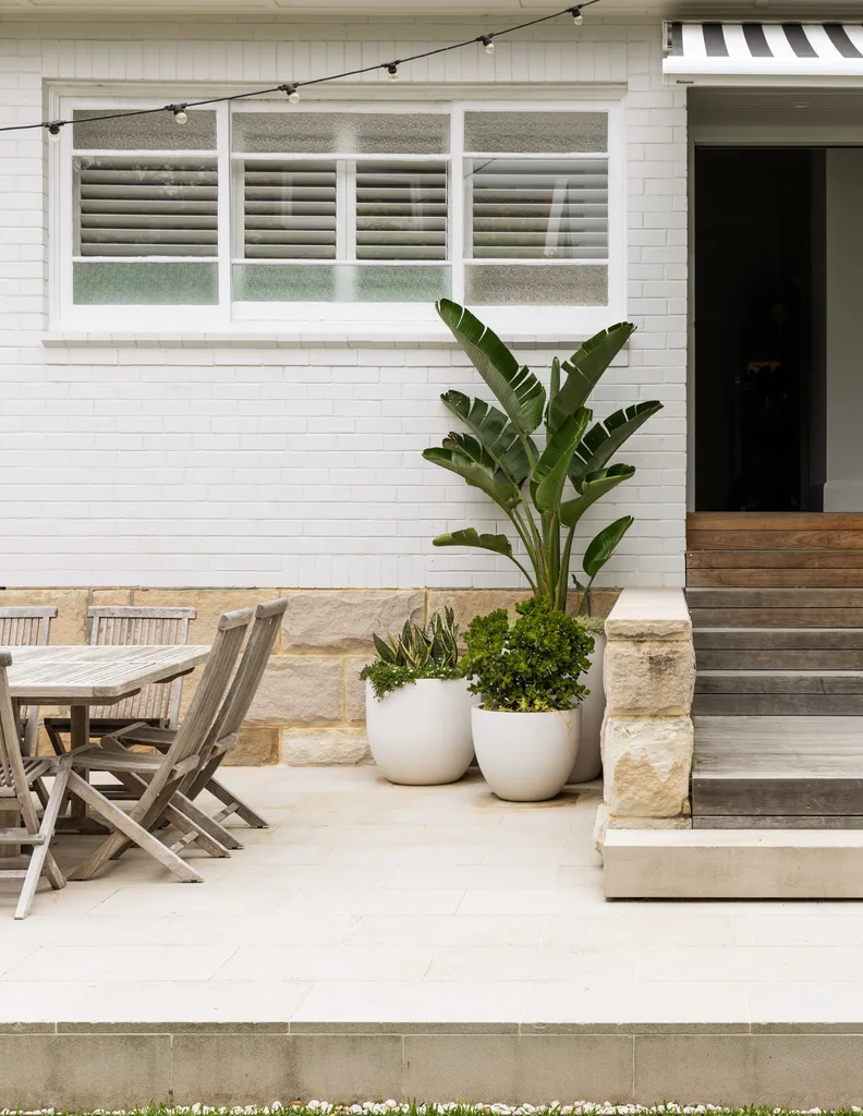 The house was painted Dulux Lexicon Quarter to give it a more contemporary edge. Gang-sawn sandstone pavers from Australian Sandstone Merchants. Wall in rock-face Australian sandstone. Pots, The Balcony Garden.
