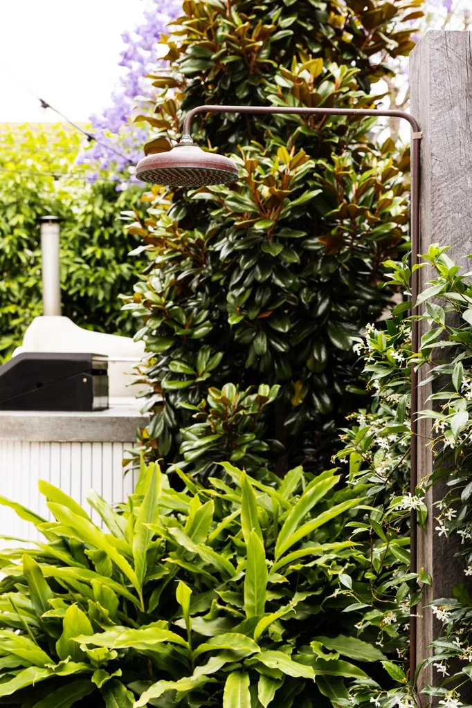 The custom copper shower and rose from Hydra Plumbing is framed by star jasmine (Trachelospermum jasminoides), dwarf cardamom (Alpinia nutans) and another magnolia (Magnolia grandiflora ‘Teddy Bear’).