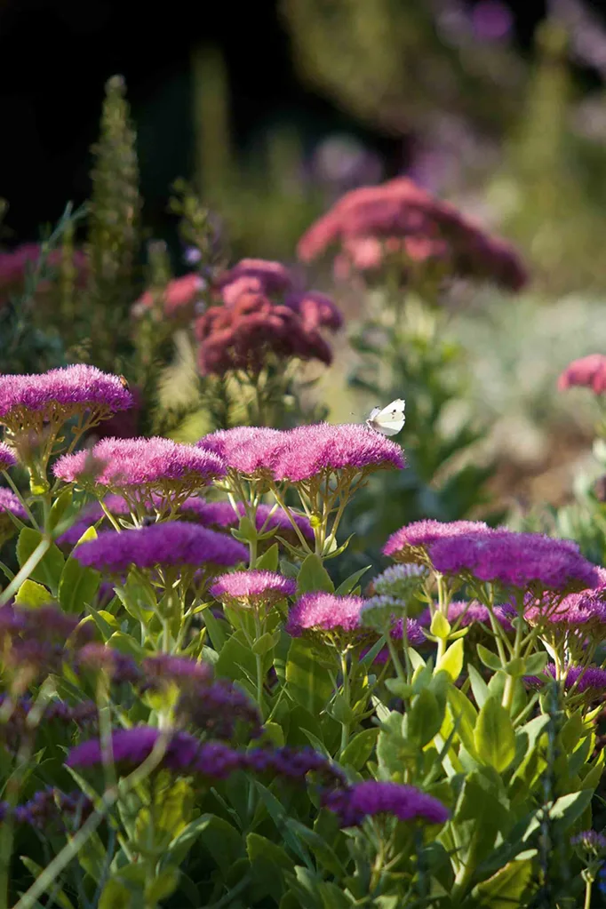 Sedums tolerate dry conditions. The foreground sedums are ‘Autumn Joy’, behind are ‘Autumn Blush’.