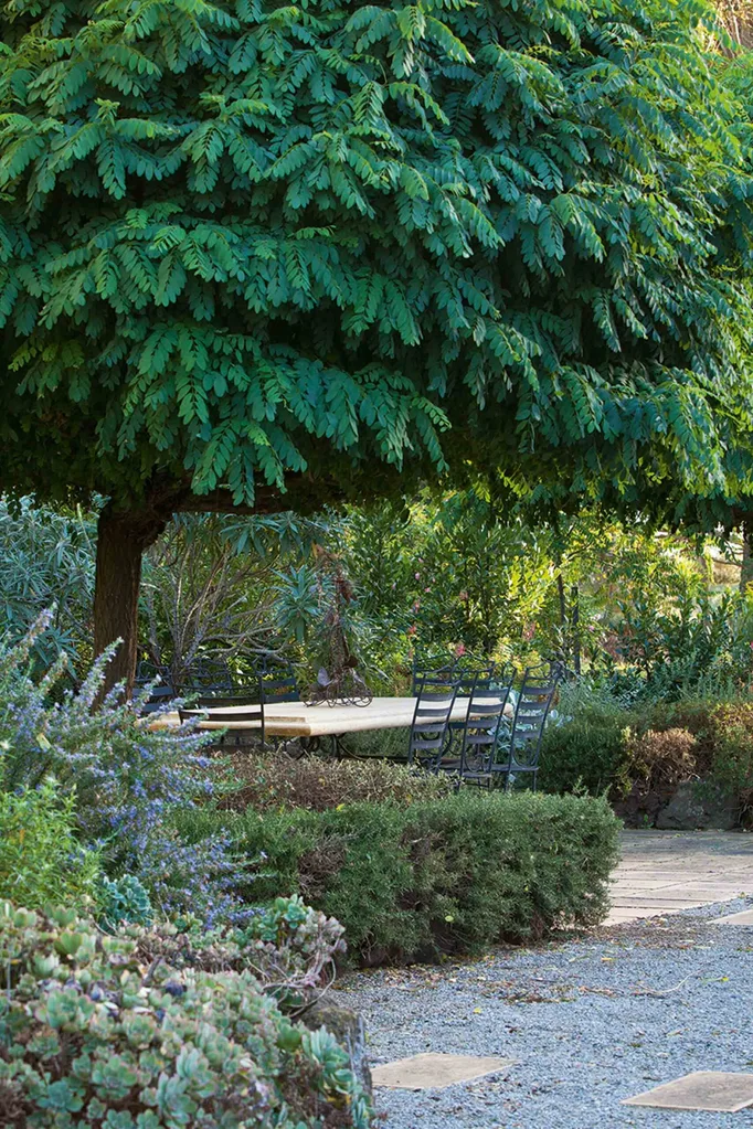 Mop top robinia trees (Robinia pseudoacacia ‘Umbraculifera’), shade a paved sitting area and rosemary and teucrium hedges.