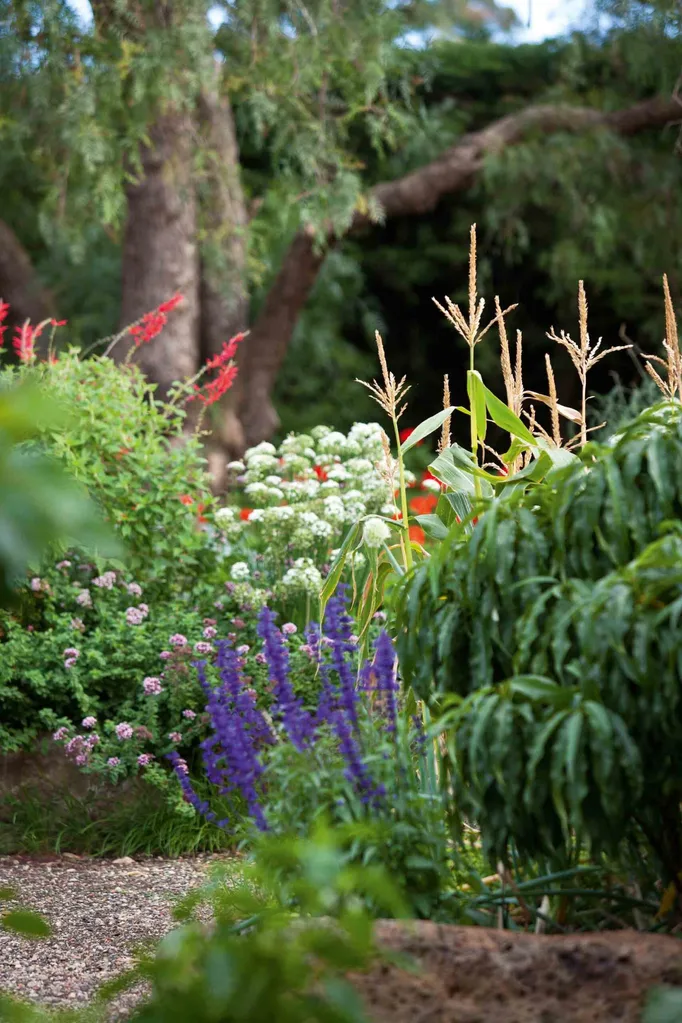 Sweetcorn in the vegetable garden is fringed by pink flowering oregano, the white blooms of garlic chives, and a red-blossoming variety of salvia (Salvia elegans).