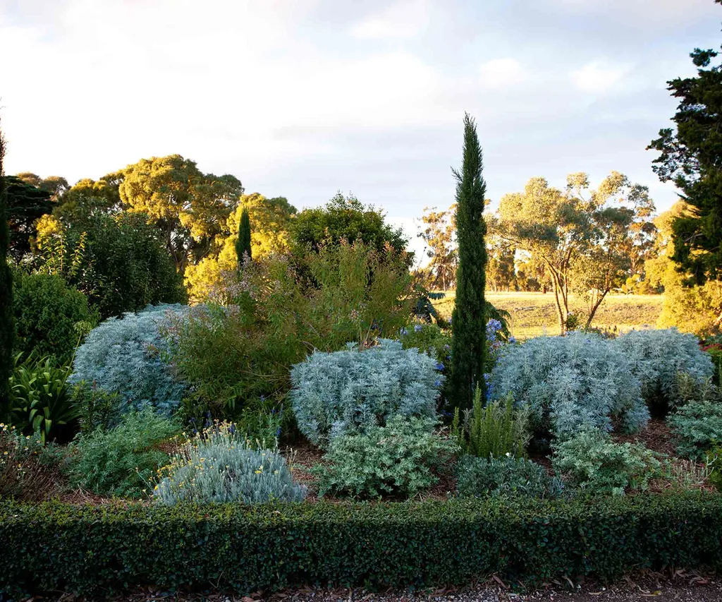 Silver foliage plants such as wormwood and santolina contrast with the dark Italian cypress trees.