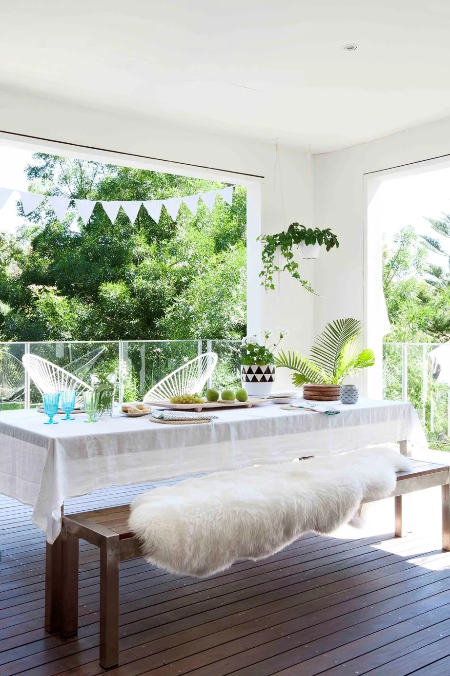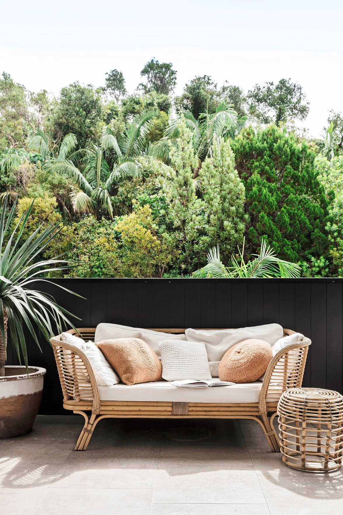 Layering textures with throw blankets, rugs and cushions can make spending time outdoors in winter much more appealing. The star of this space on the verandah of this bright coastal home on the Northern Beaches is owner Monique’s original design for the Malawi Cane single hanging chair.