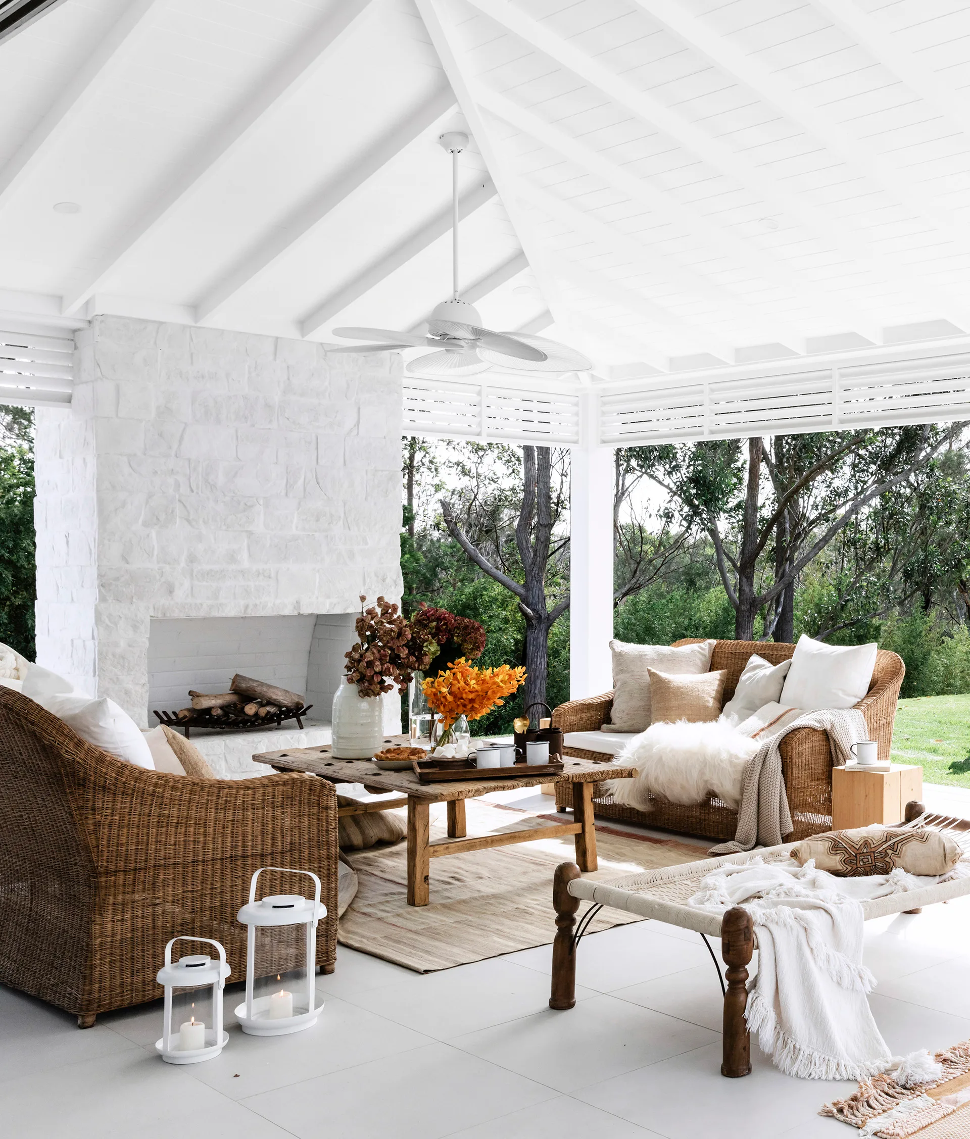 With its high raked ceiling, huge fireplace, Bahamas-style pergola, fan and ample comfy seating, this is a luxurious and cosy spot to hang out in Three Birds’ Bonnie Hindmarsh’s modern-coastal home.