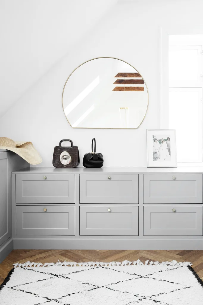 The walk-in robe features deep drawers and cupboards to mirror those in the downstairs kitchen. A Kirsten Fribert rug brings warmth to the space.