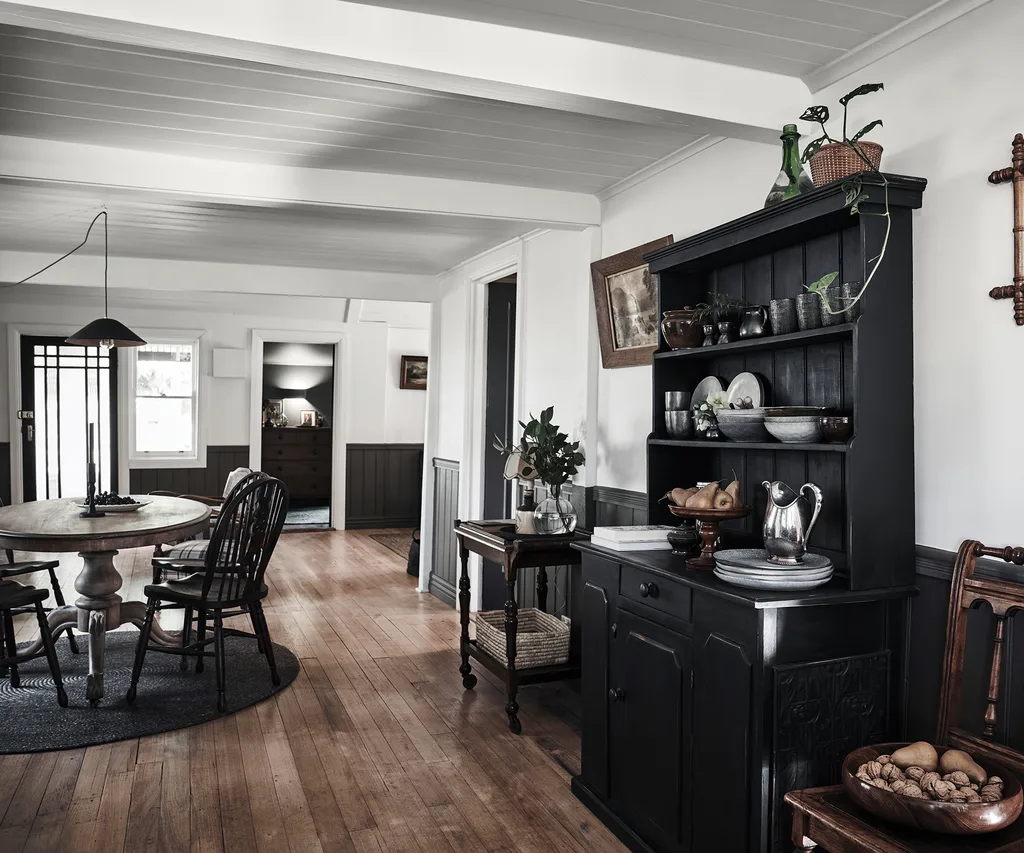 The kitchen cabinets and lower panelling in the dining and living spaces are painted in Comfort 6 from Haymes Paint.