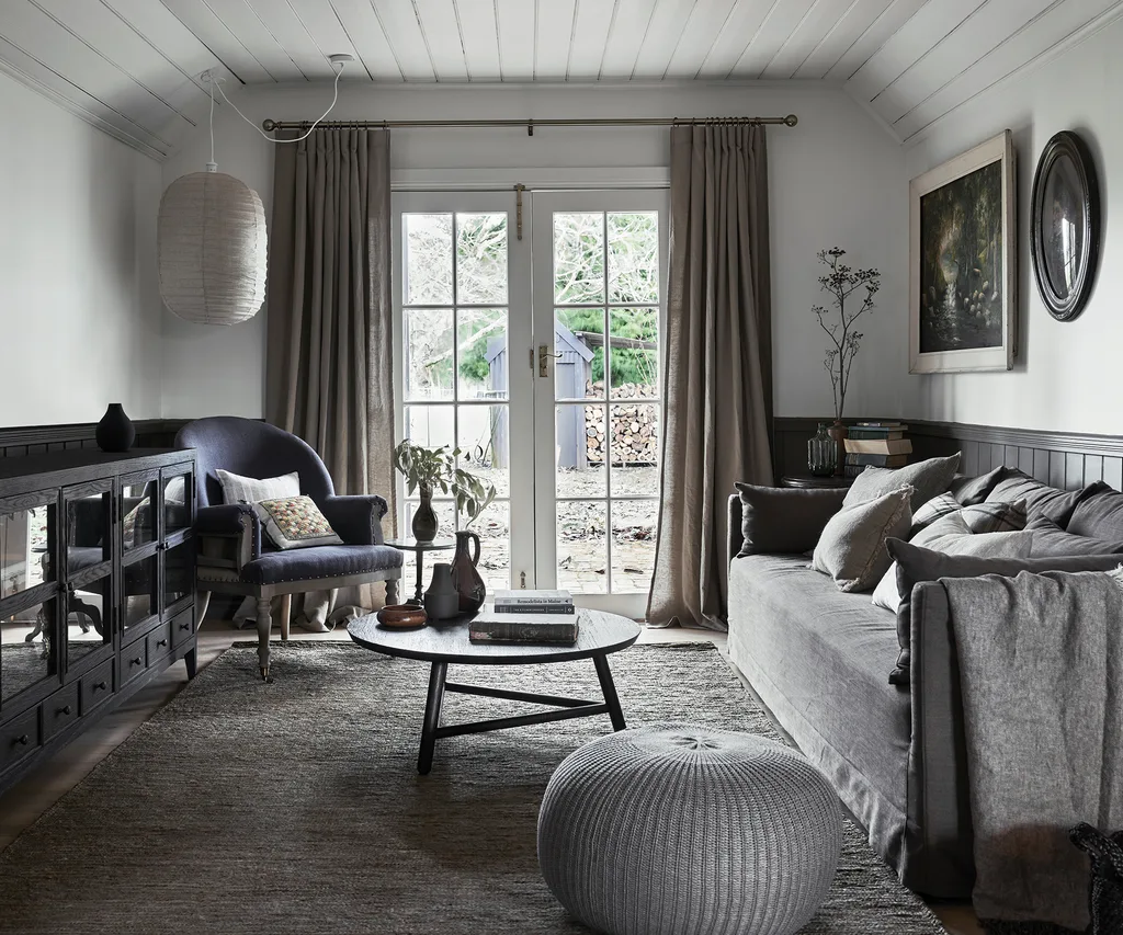 In the living room, the walls and ceiling are painted in Natural White by Dulux. The cosy sofa is from Indigo Love Collectors, while the coffee table is from GlobeWest. Sasha and Tim sourced the television cabinet and armchair from Provincial Home Living, along with a linen pendant from Imprint House, and a Ravine Handmade Rug in Quarry from Armadillo & Co. Vintage paintings reflect historical figures and the landscape.