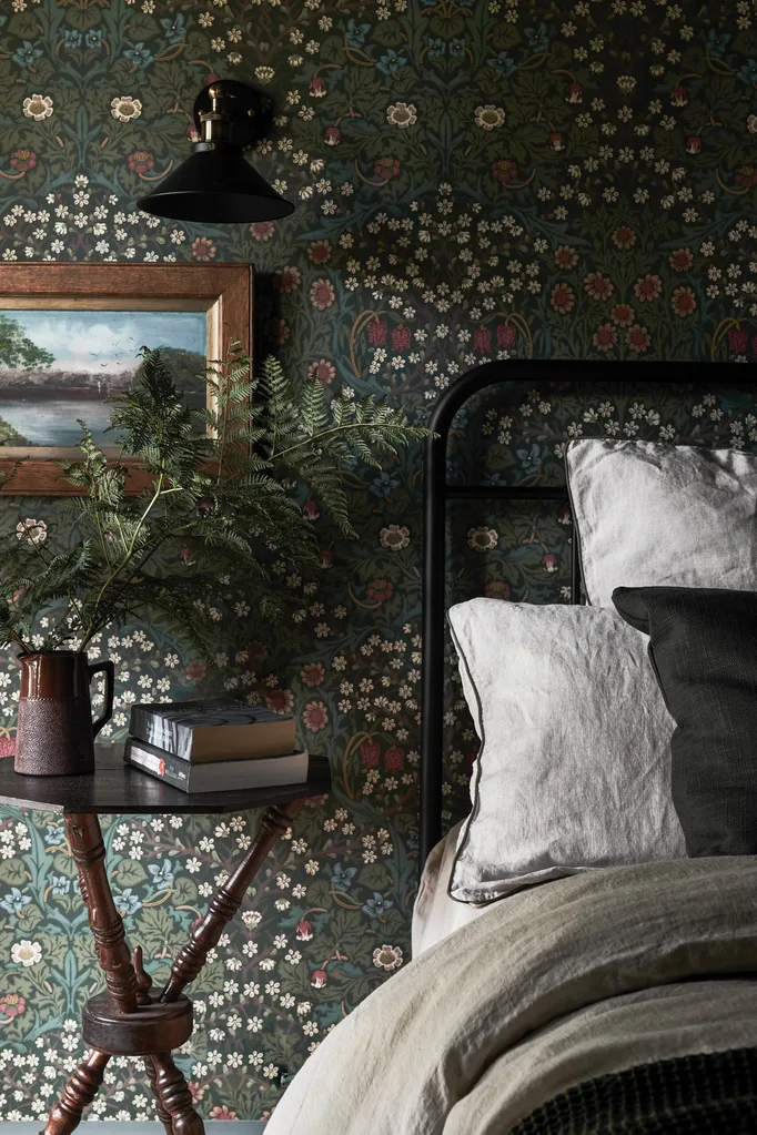 Blackthorn wallpaper by Morris & Co in the ‘Garden Room’, and a bedside table from Butlers Vintage Depot.