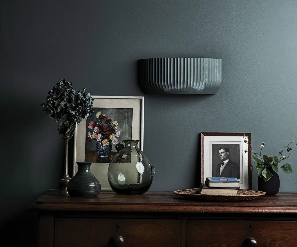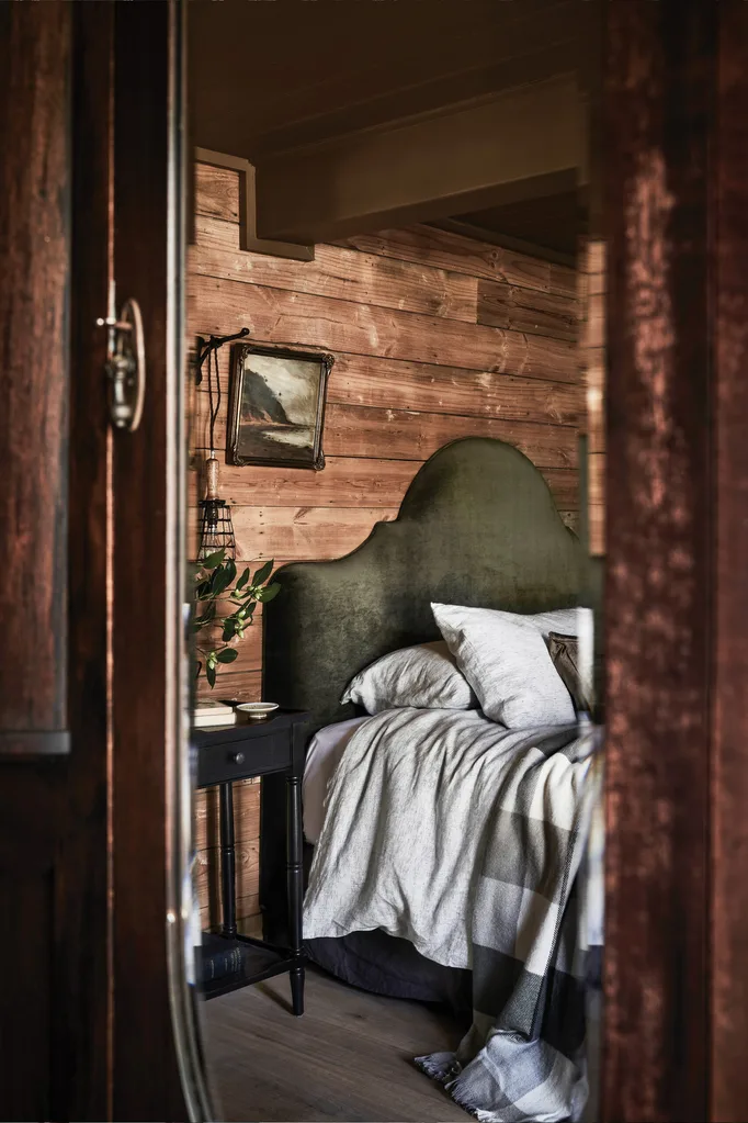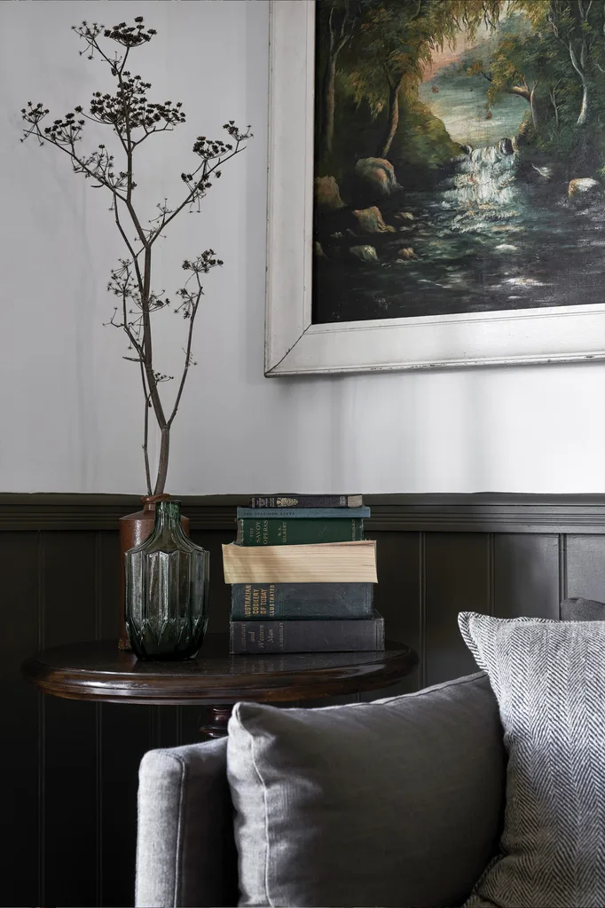 Deep, dark hues play a vital role in the enveloping effect of the spaces. In the bedrooms, the ceilings are painted the same shade as the walls – “which I would have never thought of until Belle suggested it,” says Sasha. “Because the ceilings are low, it gives you that all-encompassing feeling.” The previous owner installed French doors and large windows, which temper the moodiness and open the rooms to the greenscape beyond. “We are on a generous piece of land and you can look out and see Babbington Hill and the forest. So you’ve got all of that cosiness inside, and then you have a sense of space outside,” Sasha says.