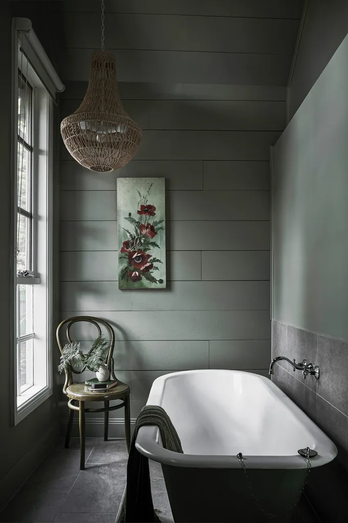 The walls of the main bathroom are painted in French Green from Porter’s Paints. The pendant light is from Ivory & Deene, while a sweet vintage painting adds charm. “The cast-iron bath is a real centrepiece – it’s deep and oversized,” says Sasha.