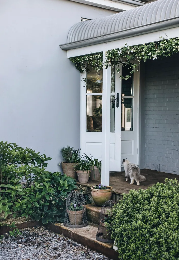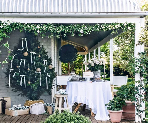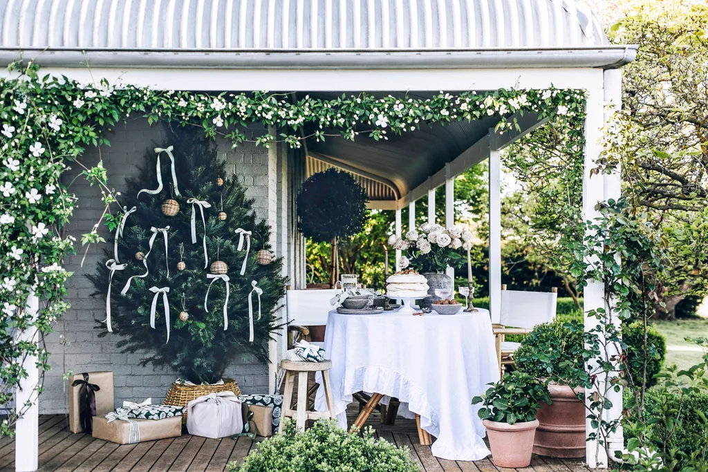 A country Christmas setting awaits on the verandah at the Sullivan family home in Millthorpe, NSW. Roses, candles, crockery and a delicious pavlova rest on a tablecloth from I Love Linen. Pots from The Jardiniere Collective hold greenery, while a clematis vine frames the verandah.