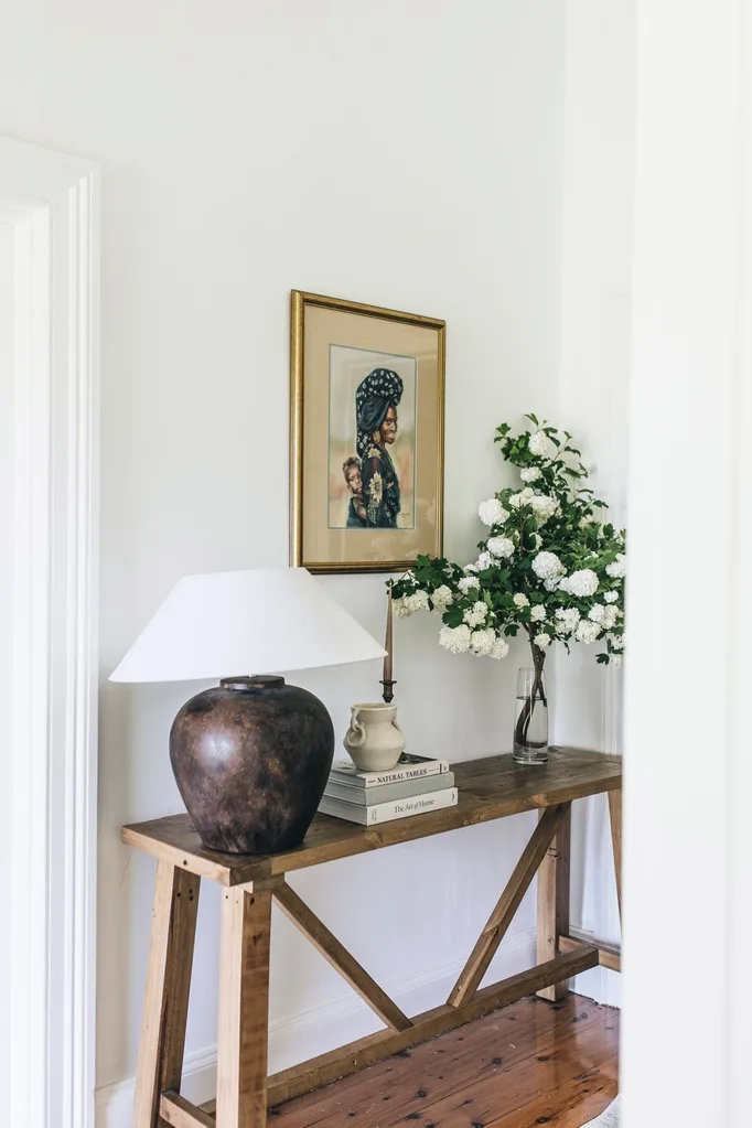 A lamp from James Lane sits in the entry beside a pastel painting of a mother and baby by Ainsley’s grandmother, Philippa McGinley. “She used to travel the world and take photographs and then come home and paint them,” Ainsley says.