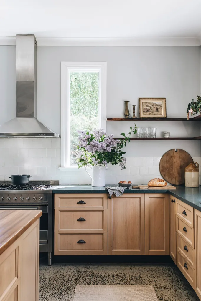 Lilac from the garden adds a soft flush of colour on the kitchen benchtop, while a framed rural scene, bought from Etsy, sits among candlesticks on the shelves.