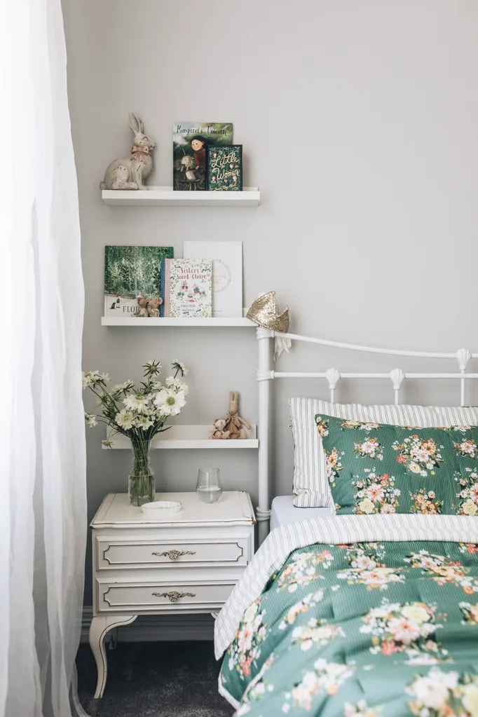 Eldest daughter Lily’s room has a bed from Early Settler, and a vintage table which once belonged to Ainsley’s grandmother. The pretty floral linen from Adairs pairs nicely with fresh scabiosa in the vase.